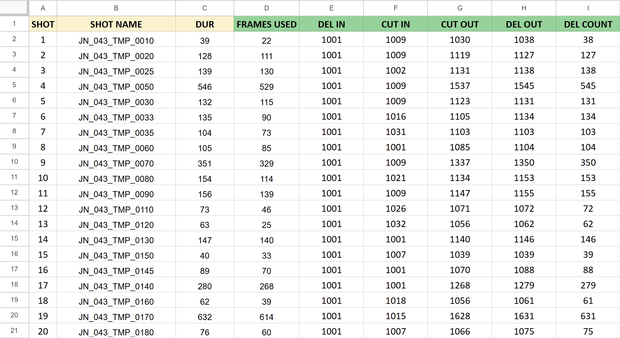 Each row is a unique shot. The DEL (Delivery) IN and DEL OUT which are used by the tool to set the start and end for the shot, the CUT IN and CUT OUT are used for the Master Level Sequence so you can scrub through the entire scene cut together without the handles (unused frames) in one sequence. The SHOT NAME contains the scene number, scene three letter code and shot number which are extracted out using a blueprint Python node and makes use of Regular Expressions (Regex). The DUR, FRAMES USED and DEL COUNT aren’t used directly but are checked to verify the other numbers.