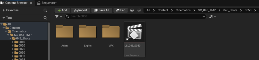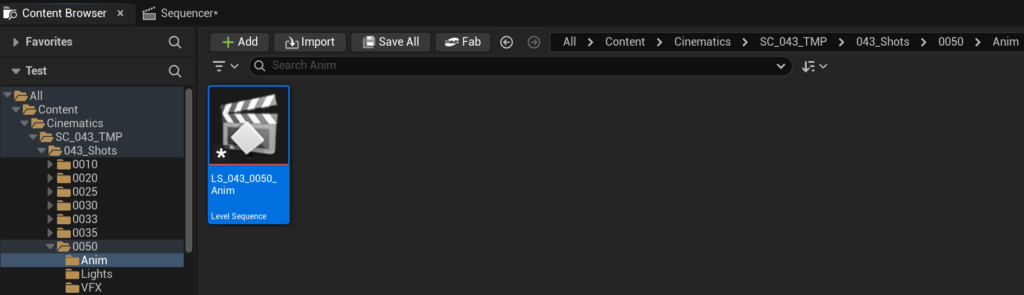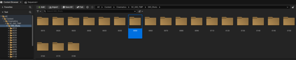It creates a subfolder within the Cinematics folder called SC_043_TMP, then inside that folder is created the Master Level Sequence called MLS_SC_043, and a 043_Shots folder which contains the individual shots.